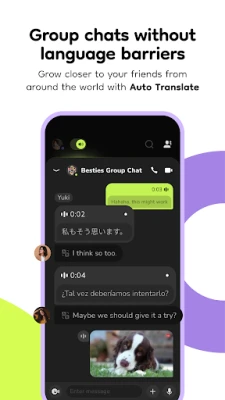 Rally your crew for a fun, lively chat. Share laughs, inside jokes, and instant banter with friends, because voices make every crowd better. Foreign languages are magically translated to one you understand!
