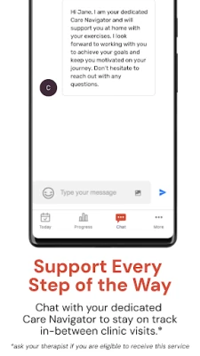 - Access to in-app chat support from your dedicated remote Care Navigator to assist with your exercises and answer your questions (*available only to eligible users; ask your therapist if you qualify for this at-home support service)
