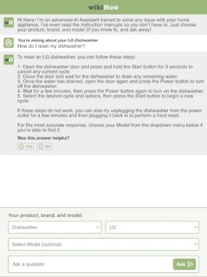 wikiHow is the world's most trusted how-to website, with step-by-step instructions on every imaginable topic. Now we've partnered with AI to solve all of your home appliance issues. Our AI Assistant has read the user manuals for your home appliances, so you don't have to. Get help with any problem, including repairs, troubleshooting, cleaning, and more.